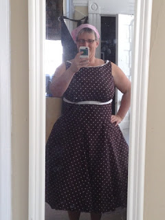 Oh, and speaking of the brown dot dress - I've decided to rip the waist out of it and redistribute the gathers under the bust - they are doing something 'not nice' under there that you can kind of see in this picture on my right side. I'll probably take a smaller seam allowance and see if I can add a little bit more ease under bust. Then I'm going to hem with horsehair braid. I think my current crinoline is a little too full for this dress.